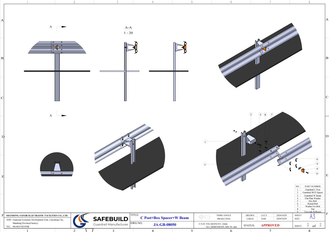 As the protective main body of the assembly, the W Beam guardrail can be selected as standard or reinforced type according to scenario requirements, and is tightly connected to the C Post through the Box Spacer to form a continuous protective barrier. The core advantage of this assembly lies in its "rigid-flexible combination": the rigid support of the C Post is integrated with the flexible deformation of the guardrail. When a vehicle collides, the guardrail absorbs energy through corrugated deformation, the Box Spacer cushions and transfers force, and the C Post provides stable support. The coordinated effect of the three components not only effectively blocks vehicles but also minimizes collision injuries, while delivering excellent visual guidance to improve road driving safety.